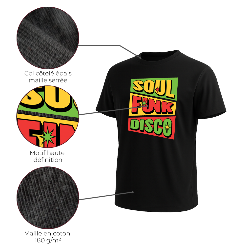 ⭐⭐⭐⭐J'apprécie le fait que l'impression soit faite en France (à Lyon). C'est un gage de qualité. Le design Soul Funk Disco est encore mieux en vrai que sur les photos. Le T-shirt est très agréable à porter au quotidien. — Antoine, Bordeaux